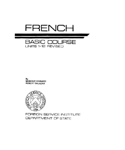 ABOUT THE COURSE . French Basic Course (Revised) has been designed to help students reach a level of proficiency which will enable them to participate effectively in most formal and informal conversations. The dialogues drills situations and narrations have been tape-recorded unless otherwise indicated in the text. For beginning students) the twenty-four units are designed for a six-month intensive training program of six hours of class per day plus outside preparation. Each unit presents a situational topic introduced in a dialogue and usually five grammar points. Each grammar point is preceded by grammar notes which generally are expressed in non-technical terms. Other units include materials of the following kinds. 1. A dialogue to provide a body of natural French conversation as a source for subsequent drills and exercises. (At FSI these dialogues are commonly memorized.) 2. Useful words to supplement the vocabulary with a limited number of additional words usually related to the topic of the dialogue. 3. Vocabulary awareness to enable the student to better identify the elements of the utterances he learned as a whole and to regroup and review vocabulary. L. Drills of six different kinds each type designed for a specific purpose. a. Lexical drills to manipulate already acquired vocabulary and improve fluency. b. Learning drills to introduce new grammar points (with reference to the corresponding grammar notes). c. Practice drills to give the student an opportunity to illustrate in sentences the grammar point he just covered. d. Question drills to prepare the student for normal conversation. e. Answer / f. Review drills (Drills preceded by an (*) have been included for optional use with fast-moving students.) 5. Situations to improve comprehension and serve as a basis for questions and elementary conversation. 6. Narrations to provide reading material and introduce a very limited number of vocabulary items. 7. Written exercises to offer to the student opportunity to relate the spoken language to the writing system.