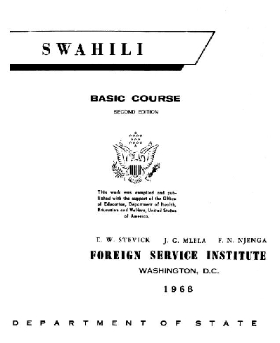 Swahili (also called Kiswahili) is a Bantu language the most widely spoken language of sub-Saharan Africa. Swahili is the mother tongue of the Swahili people who inhabit several large stretches of the Indian Ocean coastlines from southern Somalia as far south as Mozambique's border region with Tanzania. The number of native speakers is small, under 800,000. However, Swahili has become a lingua franca in much of East Africa and the Democratic Republic of the Congo. The name 'Kiswahili' comes from the plural of the Arabic word sahel sawahil meaning "boundary" or "coast" (used as an adjective to mean "coastal dwellers" or, by adding 'ki-' ["language"] to mean "coastal language"). (The word "sahel" is also used for the border zone of the Sahara ("desert")). The incorporation of the final "i" is likely to be the nisba in Arabic (of the coast), although some state it is for phonetic reasons. Swahili Basic Course aims first of all at assisting the student to develop ability in understanding and speaking everyday Swahili of a standard variety. On the basis of well-established speech habits, he can then go on with relatively high efficiency to the further skills of reading and writing. The course is designed for use in any of three general types of study situation: (1) a full-time language program of thirty or more hours per week, (2) a language program in which one or more part-time students attend class for three to six hours per week, and (3) individual study in the absence of any speaker of the language.